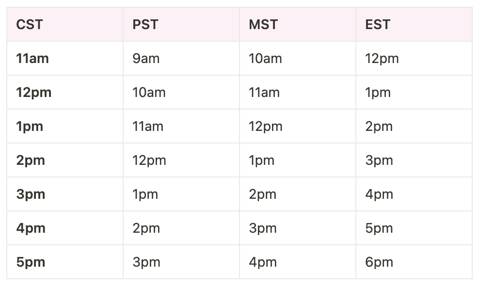 Please select all of the times that work for a 45-minute call on Sunday, March 2nd. All times are listed in CST. We've included a table above in case you need to convert.